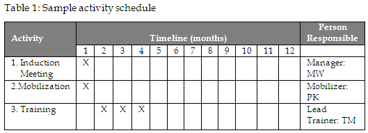 Activities are presented using activity schedule. The activity schedule enables us to consider when our activities will happen and for how long and who is responsible. The activity schedule helps us to look at the sequencing of activities because some activities will depend on others being completed first.
